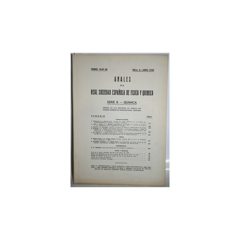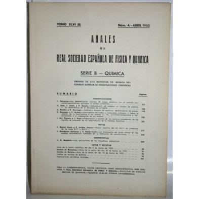 Tomo XLVI (B), Serie B-Química, nº 4. Sumario: Batuecas: La determinación rigurosa de masas atómicas por el método picnoroentgenométrico aplicable a sólidos cristalinos